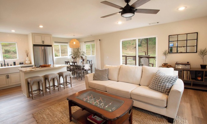 The Live Oak Oasis Kitchen is fully stocked with modern appliances, cookware, and utensils. Whether you're preparing a quick breakfast or a gourmet dinner, you'll find everything you need to make delicious meals. The dining room table offers seating four, with three additional seats at the kitchen counter.