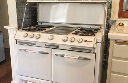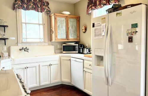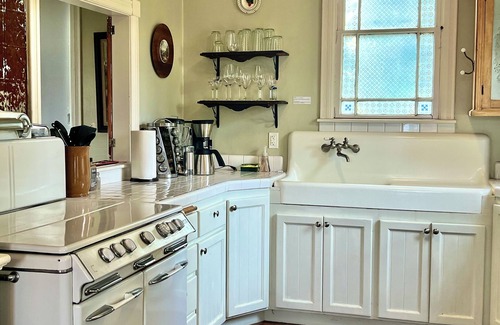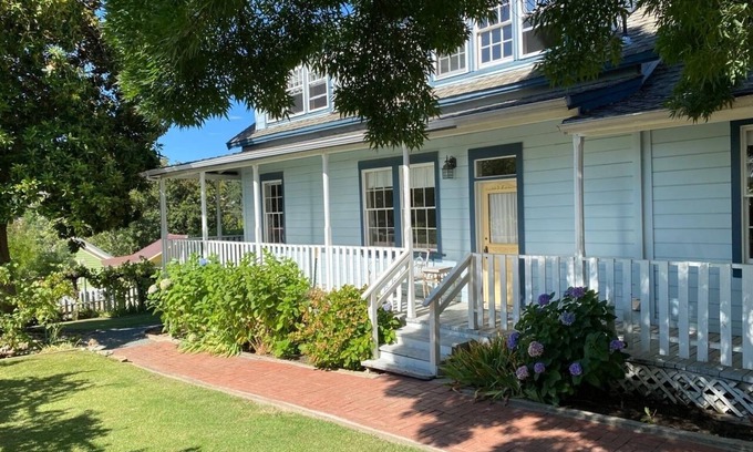 Built in 1872, this Victorian Farmhouse has all the upgrades and comfort of the 20th century! "Lorraine's Secret" is perched on a hill overlooking the Gold Rush town of Jackson. Park inside the two car garage or use one of the two off-street parking spaces. Free EV Charger in the garage. Walk through the arbor covered by mature grape vines to the front door! Rich in history the house exhibits gorgeous hand scraped, wood floors throughout. Antique furniture, original works of art and period lighting fixtures fill every room. Upstairs features two bedrooms and a bathroom with clawfoot tub. The kitchen houses a beautiful gas O'Keefe & Merritt Stove, Farmhouse Kitchen Sink and modern amenities like dishwasher, full sized refrigerator and dishwasher, microwave and drip coffee pot. Enjoy a gourmet dinner in the formal dining room or a casual fare in the breakfast nook off the kitchen. The living room features a large, flat-screen TV with Cable, high speed internet and WiFi and guest book with local recommendations and places to go. The house is fully fenced with a wrap around porch on 3 sides, lovely lawn area and a massive magnolia tree in the front. take in the view of the charming village of Jackson from the front porch or from the balcony on the second floor.