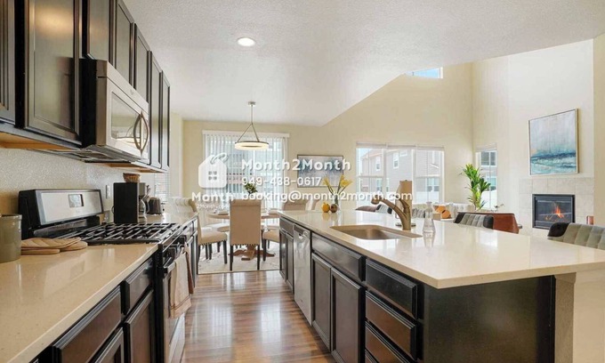 This modern, chic house in Longmont is the perfect home away from home. Features 4 bedrooms, 2.5 bathrooms, and a gorgeous gourmet kitchen with stainless steel appliances and an island. You can enjoy the delicious food made by hand with your family here. The house has a large enough office area, perfect for those of you who need to work from home. With matching furniture designed by professional designers, the living room has a fireplace for viewing and heating. Enjoy the snow season while you stay in this luxurious home.