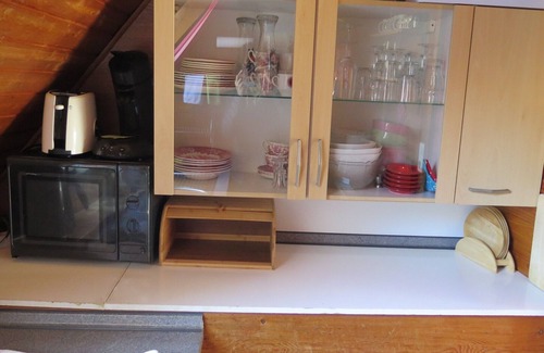 mezzanine: (dining room, Kitchenette(electric kettle, toaster, cooker(2 ring stoves, electric), coffee machine(filter), oven(mini), microwave, fridge(+ freezer)), bathroom(shower, washbasin, toilet))