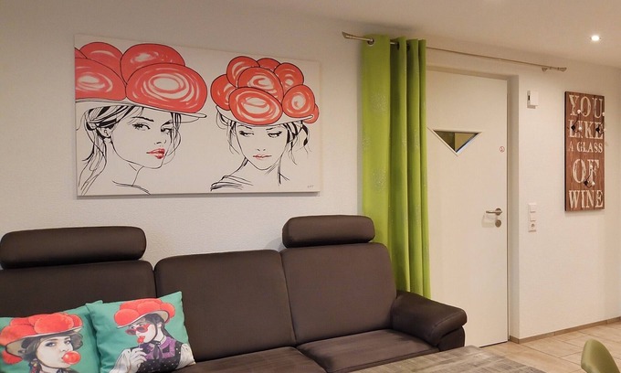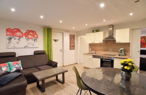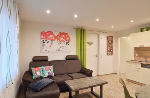 Our accommodation is a small apartment with about 35m2, near the Europa Park Rust, Strasbourg France, Basel Switzerland. The apartment is modern with a high quality equipment and a 1.40m box spring bed, fully equipped kitchenette, modern bathroom. Couch, underfloor heating. The apartment is in the granny area of our house with a separate entrance. Two cozy seats invite you to linger in front of the apartment.