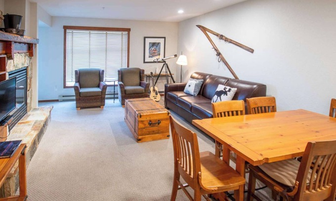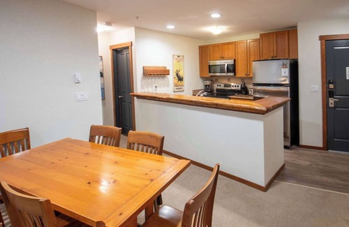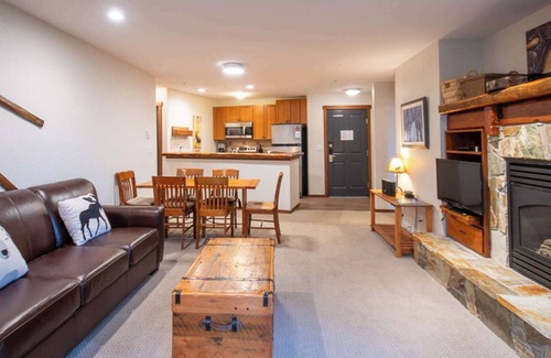 This second floor vacation rental overlooks the Mighty Moose beginners ski area. With 2 bedrooms and 2 bathrooms, this self-contained condo features a river rock gas fireplace and flatscreen television. An open concept kitchen looks through to the nicely furnished dining and lounge area. The master bedroom has a Queen bed and there are two twins over a double bed in the second bedroom. A sofa pullout in the living room brings the maximum occupancy of this condo to eight.