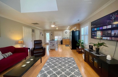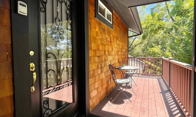 Welcome to your ultimate vacation getaway at the spacious and unique apartment hideaway in Jackson, CA. Our beautiful and luxurious one-bedroom apartment is located in the heart of the historic district and blends modern amenities with style. Stay in comfort in the California King bed, walk-in closet, spacious kitchen, cozy living room with a Smart TV, and full bathroom with shower/bathtub combo. There is also a nice deck to relax on and watch the sunsets.