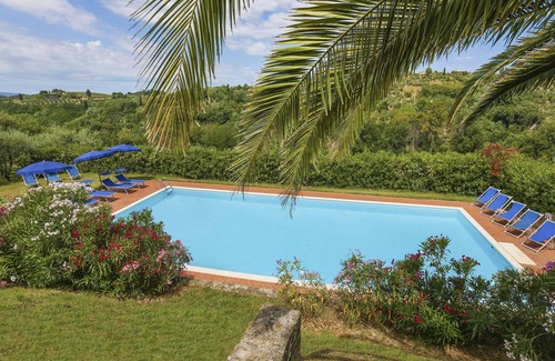 Cottage "Carbonaia", 2 storeys, surrounded by trees. 4 houses in the residence. 6 apartments in the residence. 1.5 km from the centre of Palaia, 47 km from the centre of Pisa, in a secluded position on a slope, 50 km from the sea. For shared use: property, large garden with plants and trees, orchard, swimming pool (15 x 7 m, depth 1 - depth 150 cm, seasonal availability: 02.May. - 03.Oct.). Outdoor shower. In the house: washing machine (for shared use, extra). 1 km long motor access (via unmade road). Shop 1.5 km, supermarket 8.5 km, bus stop 1.5 km, sandy beach "Tirrenia" 50 km. Golf course (9 hole) 20 km.