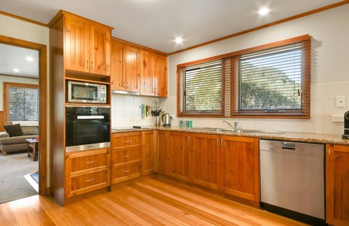 Fifteen Ninety is a spacious alpine chalet located in Tea Bag Lane in Dinner Plain, Victoria. Accommodating up to eight guests, it features three bedrooms: two with queen-size beds and one with two bunk beds. The property includes a fully equipped kitchen, a main bathroom with bath, shower, and toilet, an additional powder room, and laundry facilities. Guests can enjoy amenities such as Wi-Fi, two large smart TVs, a DVD player, and a wood log fire. The chalet is conveniently situated within walking distance of Dinner Plain's boutique cafes, restaurants, and gift shop. Please note, this property enforces strict no-party, no-pets, no-smoking, and no-vaping policies.