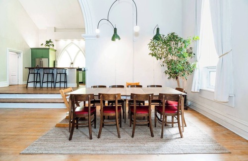 From the spacious living area, you will quickly notice the chancel has been converted into a stunning and modern kitchen boasting a induction stovetop, updated cabinetry, and all of the conveniences to accommodate guests who love to cook for a short or longer-term stay. Just down-step from the kitchen chancel area is a large dining table with lovely modern light fixtures, as well as high chairs available for tiny guests.