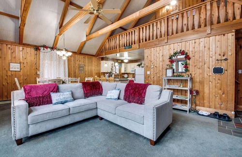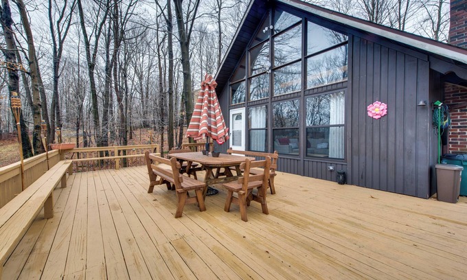 Explore the best of the Pocono Mountains from this rustic woodland cabin! Well appointed with 2 bedrooms and 1.5 bathrooms, the vacation rental offers an open interior with vaulted ceilings, a complete wall of windows, and a spacious deck with ample seating. Nestled just a short drive from Camelback Moutain and Tobyhanna State Park, you'll have easy access to seemingly endless outdoor recreation. Make use of the Big Bass Lake community pool or game room before retiring home for a movie night in!