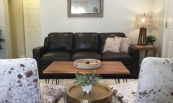 Has back patio landscaped with privacy shrubs. We provide a patio table and chairs.