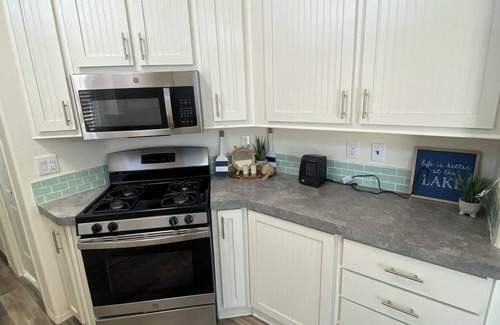 Full Kitchen: Stove, Microwave, and Refrigerator as well as cooking and eating utensils.