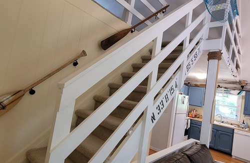 Of the front porch there is a tiered walk way to the Oar House Bunk House. Customized for all ages. there is a kitchenette, bunk beds and a cool sleeping loft with 3 super comfortable air mattresses. Bring your sleeping bags or bedding for this loft but the bunk bed is made up with fresh linens.
