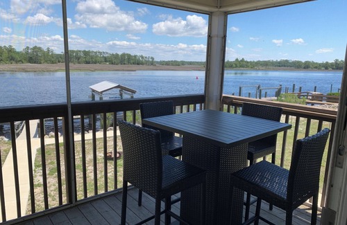 Under the stilt house is a nice patio area with Weber grill, Blackstone griddle complete with utensils, ice machine, and bait freezer. It's the perfect place to cook your catch and enjoy the spectacular view! Fold up table and chairs provided along with beach chairs and an extra fishing pole. Pedal bikes are also provided. Screened in porch above overlooks the beautiful river where you can relax and enjoy morning coffee/tea and evening drinks!