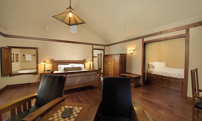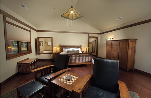 Our spacious 740 sq. ft. Caboose Cabin is the perfect choice for your family, or for you to spend a weekend with friends. The main space offers our king deluxe pillow top mattress, a sitting area perfect for watching the 49” flat screen television above our hand-tiled gas fireplace, and a private patio, complete with Adirondack furniture for two. A second bed with a queen deluxe pillow top mattress located in an open nook adjacent to the main living area. The elegant oversized bathroom features a Kohler Purist waterfall soaking tub and a spacious Italian tiled shower.