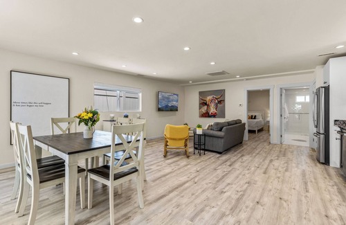 A large open-concept home with family style dining table, roomy kitchen with granite countertops, generous bedroom with luxurious king-sized high-quality mattress, and large, airy bathroom with all-glass shower. For additional guests, the couch pulls out into a comfortable queen-sized bed.