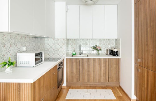 The unique flat of 43 m2 presents itself as a harmoniously composed space, comprising a living room with a kitchenette, a cosy bedroom and a modern bathroom with a shower. The flat impresses with a tailored interior maintained in an elegant blue and red colour scheme, where accessories perfectly highlight the character of the space. The living room is furnished with a comfortable sofa bed where guests can relax while watching TV, fostered by the modern Smart TV function, which allows you to easily search for your favourite films and programmes, while providing a comfortable and elegant space for relaxation and entertainment. The living room leads out onto a spacious balcony, where guests can enjoy a moment of relaxation on the elegant garden furniture, where, accompanied by the sounds of nature, they can immerse themselves in an atmosphere of peace and harmony while enjoying a freshly brewed coffee from the capsule coffee machine. The kitchenette is equipped with all the necessary appliances, such as a microwave, induction hob and fridge-freezer, the ideal place where guests can prepare their favourite dishes and enjoy homemade flavours even on the go. The bedroom is an oasis of tranquillity and relaxation, where soft lighting and bright colours promote relaxation, a comfortable bed ensures a comfortable night's sleep, while the wardrobes present help to keep things tidy. The spacious bathroom has a comfortable shower, which not only provides refreshment, but also makes every bath a moment full of relaxation and indulgence, an additional asset is the harmoniously integrated washing machine, which will certainly make the guests' stay easier.