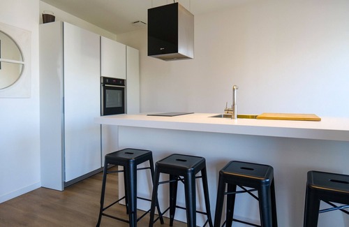 A large, open-plan, functional kitchen equipped with kettle, oven, dishwasher, induction hob, fridge, freezer, filter coffee maker, etc. You can enjoy a tasty meal on a high table with stools.