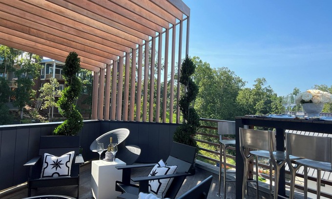 Step into the Flatiron-inspired property, boasting three floors of luxury, design, and comfort. This home offers 2 spacious bedrooms and 2.5 opulent bathrooms, suitable for up to 5 guests. The first floor showcases the living room with custom furnishings, a fully equipped kitchen with pantry, and luxe powder room. The second floor is dedicated to the primary suite, featuring a king-sized bed, a lavish full bathroom with shower, a walk-in closet, a balcony, and a dedicated laundry room with a frontload washer & dryer. The third floor houses a dedicated workspace and a guest bedroom fitted with a queen-sized bed, a full bathroom with a bathtub, a walk-in closet, and its own balcony. But what truly sets this property apart is the rooftop terrace. Equipped with a high-top dining table for 4, an outdoor kitchen with ice maker, refrigerator, fire pit, seating & large flat screen tv. *Be aware of the staircase, taking you to each level. If stairs pose any difficulties for you or your guests, feel free to reach out & make sure this space is safe & comfortable for you.