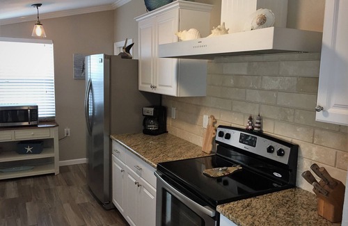 Centrally located to everything the Florida Gulf Coast has to offer. This renovated 2 bedroom/2 bath home with tile floors throughout is decorated with the Florida lifestyle in mind. The upscale, fully equipped kitchen includes granite counter tops, updated cabinetry and stainless appliances. Leather couches in the living room allow for comfortable seating while watching the large Smart TV complete with High Speed Wi-Fi for streaming. Each Bedroom has a Queen Bed with linens provided. Completely updated bath has large walk-in shower, blue tooth speaker and includes towels. Brand new 2nd full bath offers a large corner shower. Indoor air conditioned laundry with stacked washer and dryer.