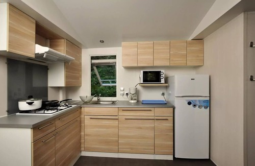 Equipment: The mobile home includes a kitchen area equipped with fridge / freezer, 4-burner stove, microwave, electric coffee maker, kitchen utensils and crockery adapted to the number of people in the accommodation. The terrace has a garden furniture. Pillows and duvets are included for each bed (optional sheets). Please note: The bed sizes mentioned are not contractual. It is possible to have slight differences in size depending on the rental models. Bed arrangements and decor may also vary.