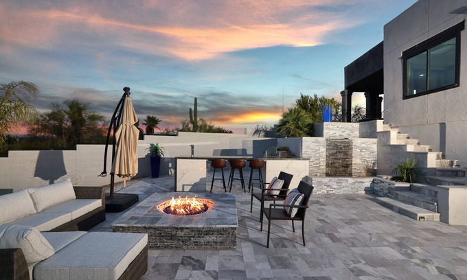 Views of the mountains from every window in the house upstairs. Whether you are having evening glass of wine on the Rooftop patio w the sunsets, watching the Sunrise on the East upper patio or a quiet night by the fire pits and pool, you will find relaxation. 2,000 sq feet of Mexican Travertine on back patio, Massive outdoor Kitchen with built in Keg, wine Refer, beer refer and 20 feet of granite countertop for guests and meals.