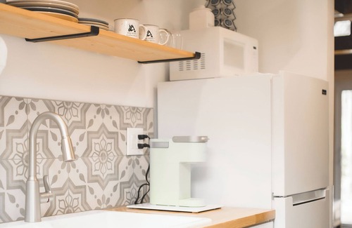 Sink into the charm of the bathroom with its black and white mosaic tile floors and rainfall shower head, then ascend the ladder to the cozy loft bedroom. Here, you'll find a dreamy retreat complete with a plush queen-size bed, Moroccan-style seating, and even exercise gear for those morning stretches.