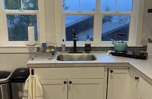 Beautiful views as you make your coffee/tea in the am. Microwave, Large toaster oven, Double hotplate, stocked with all needed kitchen items including a crockpot.