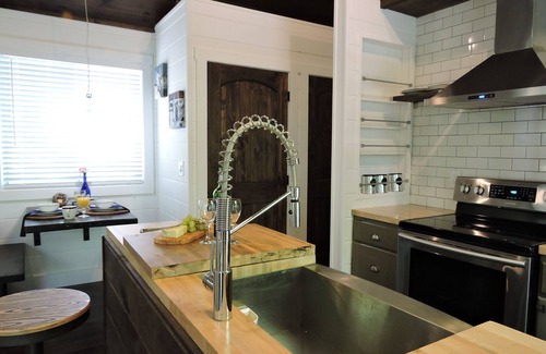 The bedroom is furnished with a king bed, in addition to a smart TV and BlueRay DVD. Our kitchen has SS appliances, (dishwasher, fridge, stove with oven) and microwave with a farmhouse stainless steel sink, and all essentials for your gateway cooking needs if you choose to eat in. You can also take advantage of a gas fireplace in the living room and a sofa, which turns into a queen bed if you bring extra guests, bringing the total occupancy up to 3 people.