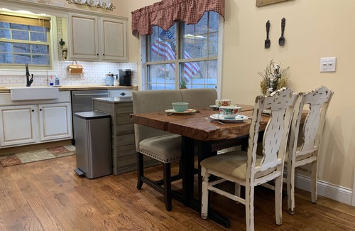 This 3BR 2BA cabin offers much for you to enjoy. From an open-concept kitchen with all stainless steel appliances, a convection/gas oven/stove, a Keurig, waffle maker, instant hot water kettle, air fryer, blender, dining, and living room area (with sleeper sofa), with a full-size washer and dryer, a screened-in porch, a gas grill, and a large fire pit! Come and relax in the private hot tub on the screened-in back porch and watch your favorite movie or sports on the TV!