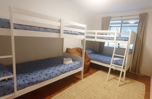 The house has three bedrooms; two with queen-sized beds and one with two bunk-beds.