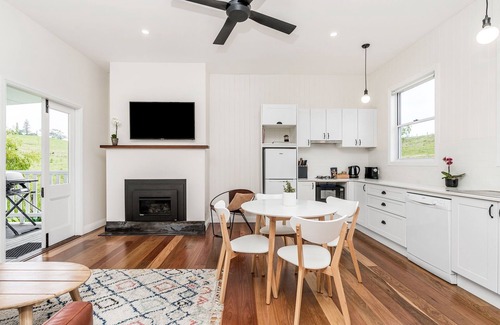 Each cottage is self-contained and features all white interiors and timber floors. It feels like a home, the main section of each cottage has 3 metre high ceilings, ceiling fans, air conditioning, kitchen and laundry facilities. Great views of the farm from your large verandah with BBQ, outside dining table and cane chair furnishings.