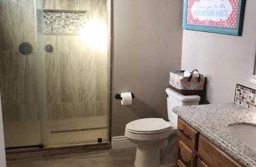 Quiet and peaceful detached guest house sleeps 6 with two queen beds and a futon sleeper. Curtain separates the room for privacy. Large 65” flat screen tv, large dresser, small table and four barstools with a full size fridge with water and ice on outside of the door, and microwave. Walk in closet and huge walk in shower in the bathroom with double shower heads. New!