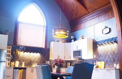 Where the altar once was, is now a spacious eat-in kitchen. Crisp, clean and modern, this kitchen is fully equipped for all of your cooking needs. Enjoy a tasty home cooked meal around the huge dining room table, or sip a quiet cup of coffee at the bistro set and watch the passersby through the window.