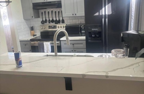 The open-concept living room is the perfect place to relax after a day of exploring SeaWorld or other San Antonio attractions. Sink into the plush sectional sofa (which is also a convertible sleeper) and watch your favorite shows on the wall mounted, flat-screen ROKU TV, or use the free high-speed Wi-Fi to stream movies or catch up on work.