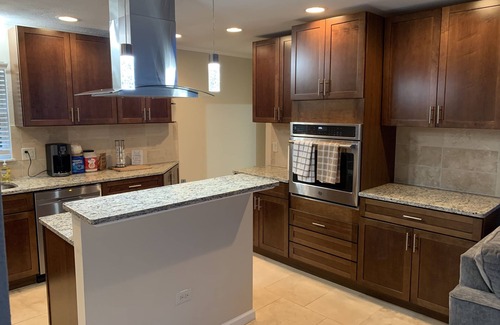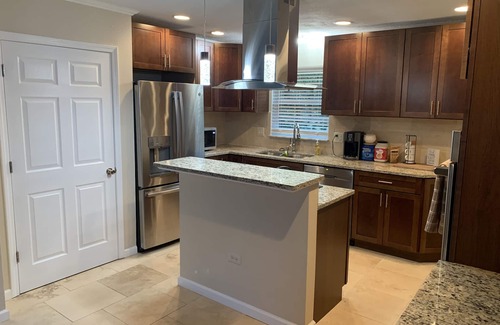 This home is modern and very relaxing with an open floor plan. The living room has a large flat screen smart tv, electric fireplace and a large window to bring in tons of sunlight. The kitchen has plenty of cabinets, a lot of granite counter space with stainless appliances that include refrigerator, oven, dishwasher, electric stovetop with overhead exhaust and microwave. The dining room has a oval table that seats six with a large window providing plenty of sunlight. The top floor also has two bedrooms. One bedroom is large with a queen bed, deep walk-in closet and a large window overlooking the back deck and wooded scenery. Another bedroom is slightly smaller with two closets and a large window looking out to the front of the house. The lower level has a large master bedroom with three closets and an attached custom bathroom with a very large walk-in shower. The family room has a large flat screen smart TV with two sofas and ottoman, a dry bar and patio doors that walk out to the large deck. This home also has a laundry room with a washer and dryer.