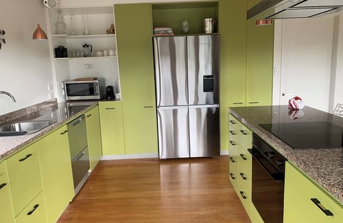 A spacious well-equipped kitchen with the latest appliances. Refrigerator with icemaker and chilled water dispenser, induction cooking plus microwave and coffeemaker.