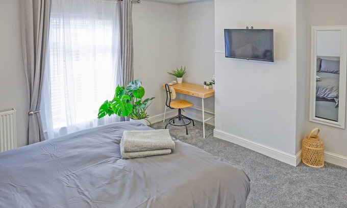 The property is a four bedroom town house. It has been recently refurbished and furnished to a high standard in order to comfortably accommodate short to medium stays. The house has a beautiful fitted kitchen with integrated appliances, a comfortable living space and a modern stylish shower room. The bedrooms are all double beds with Smart TV's in each room. The bed rooms are stylishly decorated and thoughtfully lit. The decor throughout is Scandinavian inspired with a nod to bohemian style to soften the look. We expect guests will benefit from self catering with laundry facilities, washer and dryer and easy access to local amenities, place of work and leisure.