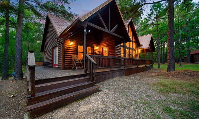 Nestled amidst nature's tranquility, Four Pines offers the perfect Beavers Bend getaway. Imagine waking up to the gentle sounds of a trickling stream and the sight of a serene pond. This luxurious 3-bedroom cabin features a cozy loft, a sun-drenched sunroom, and 2.5 bathrooms. With additional sleeping options throughout, Four Pines comfortably accommodates groups seeking a spacious and relaxing retreat.