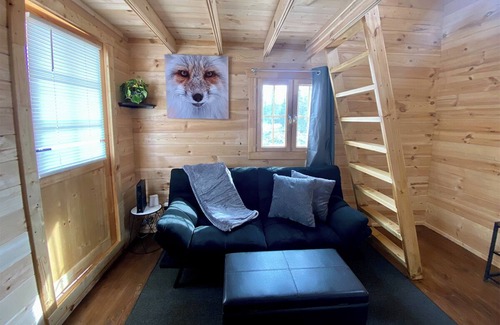 This charming lakefront cabin combines modern comfort with natural beauty. The open living space downstairs includes a kitchenette, toilet, and shower, while the loft features a cozy queen bed. Step outside to enjoy unparalleled views of Nations Mountain (~5,000 ft) and Panorama Mountain (~5,700 ft) from the front door or relax on the deck with a BBQ, soaking in the stunning scenery. This tiny home style cabin is 225 sq ft.