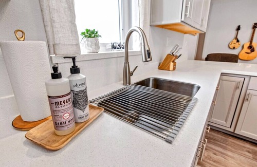 The Foxhole Retreat features a full kitchen if you like to cook your meals in. You`ll find everything you need to cook a meal. There is no dishwasher, but you will find an oversized dish rack to make dishwashing easy. There is also a coffee station that includes a locally roasted coffee sample from Farm Loop coffee and Felicity Loft tea. You`ll have a ninja drip coffee maker and also a pour over coffee maker. Drink your coffee using the peek-a-boo fox mugs.