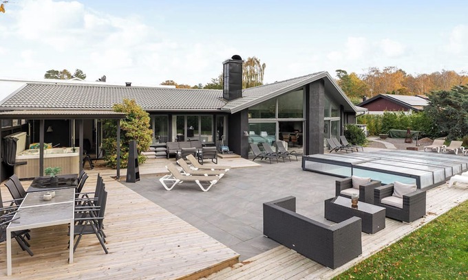 Large, modern, beautiful villa "Frösakull Paradiset". 10 km from the centre of Halmstad, 101 km from the centre of Helsingborg, 800 m from the sea. Private: natural state property, beautiful, well-kept terraced garden flowers and trees, swimming pool angular, heated (6 x 4 m, seasonal availability: 06.Jun. - 29.Aug.). Hot tub, parking (for 2 cars) at the house. Shop 1 km, grocery 1 km, supermarket 1 km, shopping centre 5 km, restaurant 1 km, bar 1 km, bakery 1 km, bus stop 100 m, railway station "Halmstad Central Station" 10 km, ferry "Helsingborg" 101 km. Golf course (36 hole) 6 km. Nearby attractions: Tylösand, Ringenäs Golf Club, Grötvik, Halmstad City, Hallarna Shopping Center.