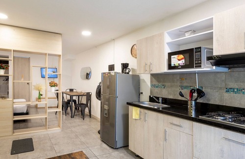 Queen bed and sofa bed, located in a residential neighborhood in the center of Medellín, which will allow you to travel to the best tourist sites easily, 2 blocks from the "Pabellón del Agua" Tranvía station that connects you to the Metro. Fast and stable Wi-Fi, autonomous entrance, hot water and parking for motorcycles. All you need at your fingertips!