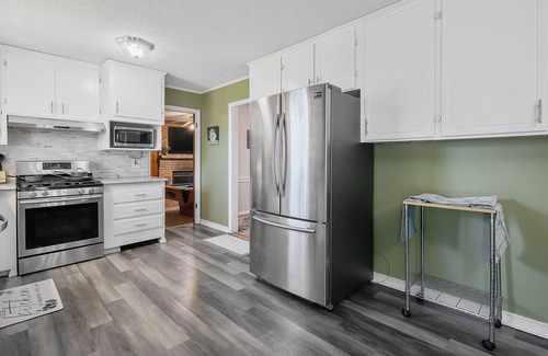 As you enter, be captivated by the warm and inviting atmosphere in the main living area of this updated house. The cozy living room layout boasts a couch with lounge perfect for family gatherings and movie nights around the large flat-screen TV. The fully stocked kitchen features stainless steel appliances and granite countertops. The dining area offers seating for six with a large table.