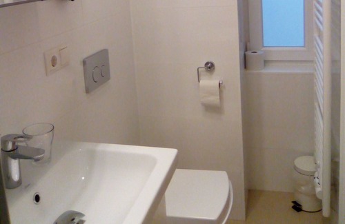 After entering the flat on the first floor of the building (elevator available), you're in a small vestibule with a window, facing the courtyard. From this room, you can enter the small but very nice bathroom, which is complelty new designed with timeless flaggings and a great walk-in-shower. The bathroom has also got a window, which faces the courtyard and there is a towel-heating placed in the bathroom.