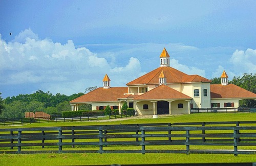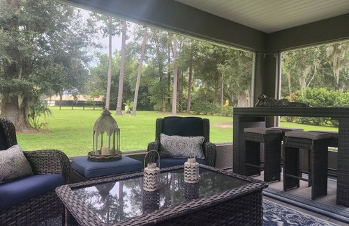 Nestled in Ocala, this delightful house with cathedral ceilings offers 4 bedrooms with the master bedroom and master bath on the first floor and 2 queen, and 1 twin bed and two full baths upstairs. Fully renovated last year, the property boasts a quiet, gorgeous neighborhood (evening walks are a must) with a small neighborhood that is surrounded by two of Ocala's biggest horse farms. The peaceful ambiance is perfect for guests looking to unwind and relax, especially on the patio. With amenities like a large washer/dryer, two car garage with remotes, AC, cleaning supplies (if needed), WiFi, 75" TV, fully stocked kitchen with a wine fridge (just in case) and coffee maker, and a dining room that seats 6-8 comfortably. Guests can enjoy a fabulous stay with all the comforts of home, including four rooms with gorgeous bay windows. Our place is equipped for both long or short stays, is 3 minutes from the World Equestrian Center with shopping, over 10 restaurants and lots of activities for kids and adults alike (well beyond activities involving horses). It is also where the world's best equestrians compete in all disciplines including the spectacular Saturday Night Grand Prix with top showjumpers (free). The home is near shopping, restaurants, grocery and other conveniences, as well as some of the most gorgeous horse country given that Ocala is the Horse Capital of the World. You will love the home's location, space and it's the perfect home for guests and/or singles/couples with three full baths. There is even an office that is available to use if you need to bring your computer. If anything goes wrong, it will be addressed immediately and conscientiously. Weekly maid service is available for a fee for longer term stays.