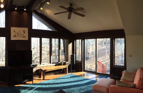 This 3-bedroom house in a quiet neighborhood lets you stay close to nature while only a short drive to Main Street in Beacon. Great hiking trail right around the corner. Large open living room for hanging out and relaxing, surrounded by windows with views of the backyard. Side patio has a fire pit and gas grill. Modern, stocked kitchen and dining room for group meals. New, comfortable beds in each bedroom.
