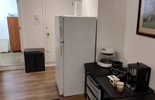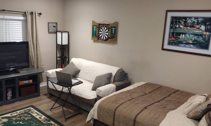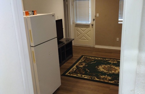 This little place is a garage efficiency connected to our larger house. Its for people looking for an economical monthly stay near town. It has two walk-in closets and a large living room with with a sleeper couch, small dinning table, full fridge/freezer, Toaster oven, microwave, full bathroom & free Internet TV. We provide some board games to keep you having fun. We also have security cameras on the outside of this unit for your safety. We are available 24/7 if you need something during your stay.