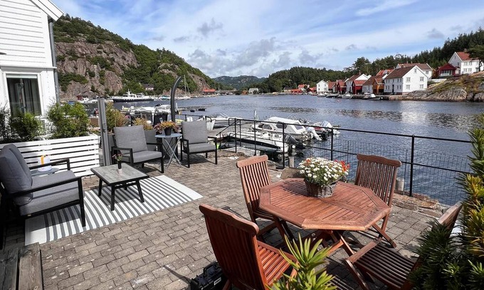 The modern furnished vacation home Furuholmen Brygge 33 is located directly on the picturesque fjord, fishing and family-friendly on the very well-kept vacation peninsula 'Furuholmen' with road access to the mainland. From the terrace with the boat mooring in front of it, there is a wonderful view of the marina and the island opposite, as well as towards the fjord outlets to the sea. Despite the traffic-calmed peninsula, the well thought-out architecture makes it possible to drive right up to the front of the property for loading and unloading. Your vehicle can then be parked safely and free of charge in an underground garage, which is concealed beneath the island. The small marina created especially for guests with boat and bathing areas, as well as the buildings designed in a South Sea flair and the clean surroundings will certainly meet the highest vacation demands. For water sports enthusiasts, families and anglers who love a high-quality and well-kept environment, the beautiful location of the house directly on the water and close to very good fishing grounds on the open sea and the adjacent fjord world offers the best conditions for a wonderful vacation.