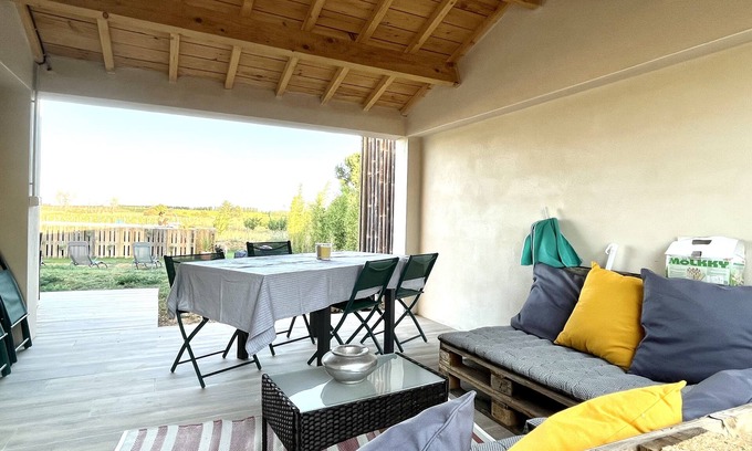 At the gates of the Camargue and the seaside resorts, it is on the magnificent land of the Costières de Nîmes that our Gîte is located. With an area of 125 m2 consisting of 4 spacious bedrooms, including 2 master suites with private bathroom, walk-in shower and Queen size bed the 2 other bedrooms one with Queen size bed the 4th bedroom with 140 bed communicating through the bathroom bathroom with walk-in shower, a large living room with fully equipped kitchen, induction cooker, washing machine, dishwasher, flat screen TV, unlimited Box 4G air conditioning. A shaded terrace with its table for 8 people, 1 large fitted above-ground swimming pool, deckchairs, a 4-person Jacuzzi and its woven furniture. a BBC corner and petanque ground Everything is there to relax during your holidays in the heart of our 15 ha estate operated in organic and biodynamic agriculture. During your stay, you can taste our wines and share our passion.