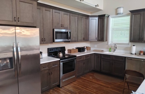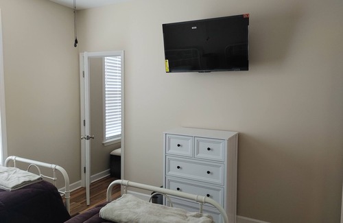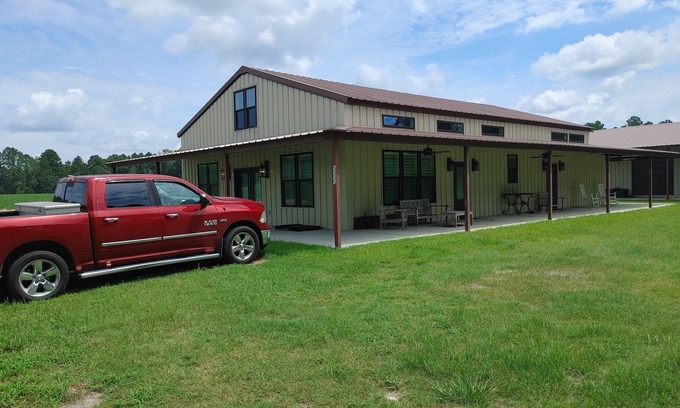 Modern Statesboro, Ga 3-bedroom farmhouse lodge with country charm. Short drive to Ga Southern University Situated on open farm land with pond The wide open floor plan features 1 queen bed with master bath and 2 bedrooms each with 2 twin beds, with Jack and Jill bath between. The 3rd Bath with shower sink and toilet located just outside of the lodge and under well lit protected area outside. Perfect for families or friends traveling together. Cook meals in the full kitchen, or grill out. Main lodge area has wet bar, with big screen TV. Enjoy the large outside covered porch perfect for relaxing on the comfortable outside furniture. Washer and dryer, WiFi,