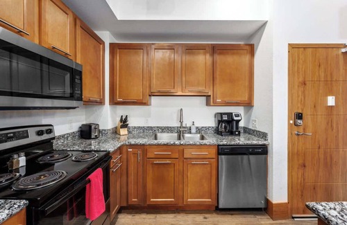 This apartment features a fully-equipped kitchen, in-unit laundry, lightning-fast WiFi, smart TVs, and complete privacy throughout your stay. Additionally, there is no need to worry about expensive parking fees - This location offers free parking for two cars in the attached garage and additional free parking in the parking lot.