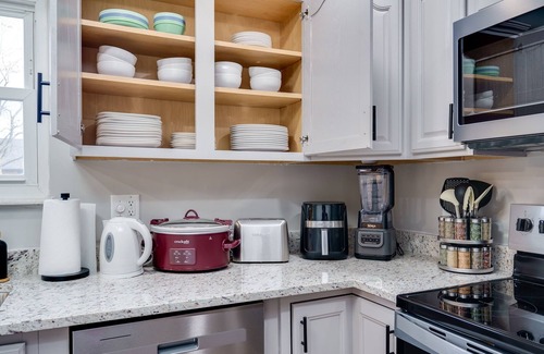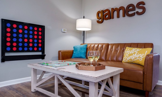 Downstairs, relax in the cozy living room with a 65-inch TV and a fireplace, or cook in the large kitchen with brand-new stainless appliances. Enjoy meals at the breakfast table or the dining room table, which seats 6. For fun, the game room offers a foosball table, two arcade games, and another TV.
